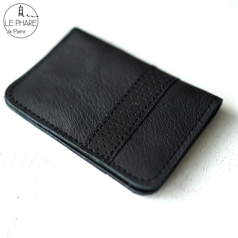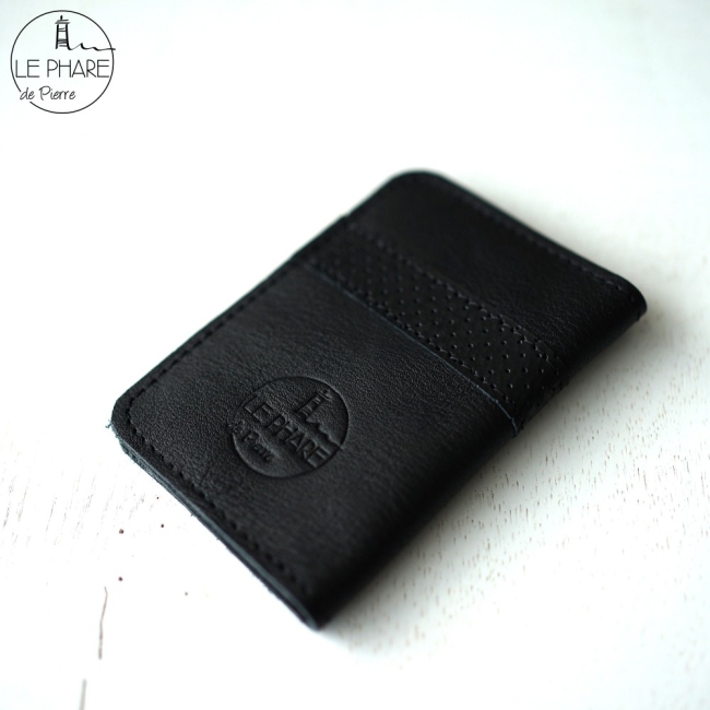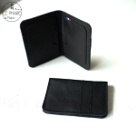 Portefeuille compact réalisé en cuir noir pleine fleur. Format pratique de 12 × 8 cm.