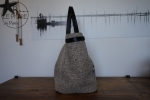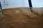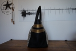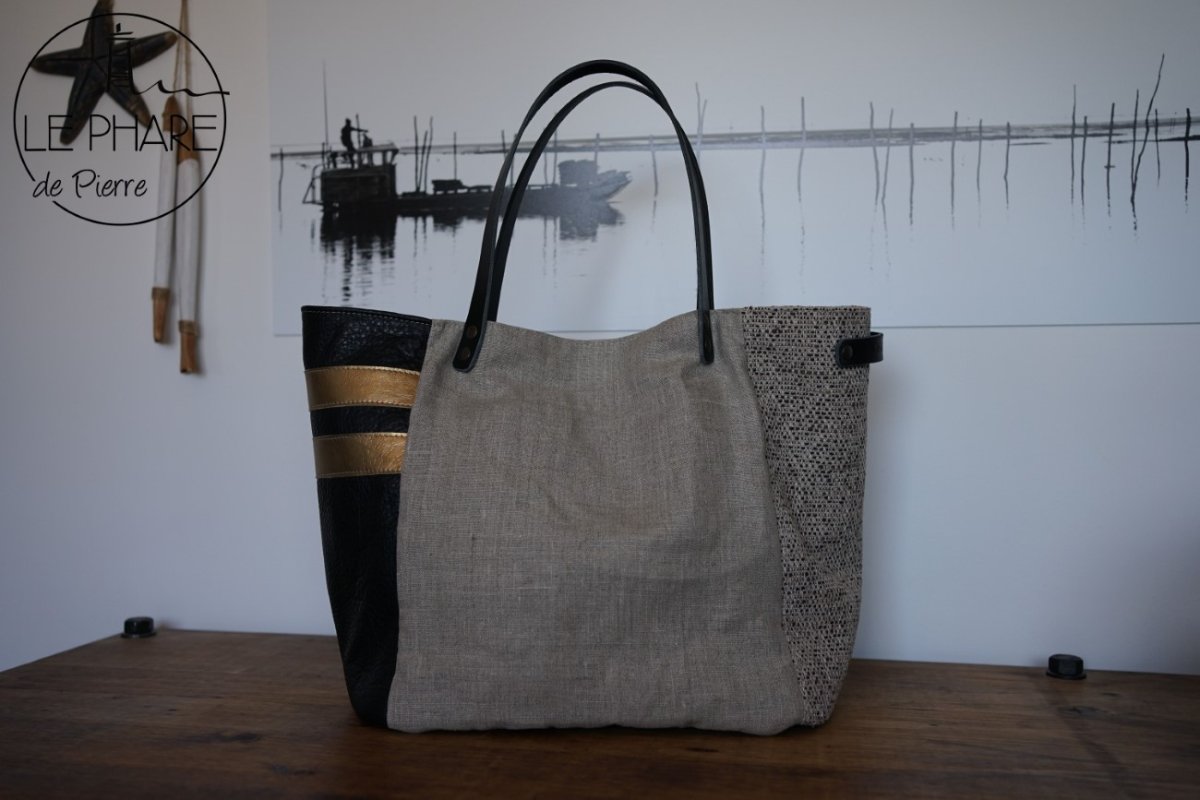 Des bandes de cuir dorées viennent illuminer l’ensemble et ajoutent une touche joyeuse et solaire. Les anses sont en cuir collet noir, robustes et confortables à l’épaule. Ce cabas est une pièce unique, réalisée avec soin.