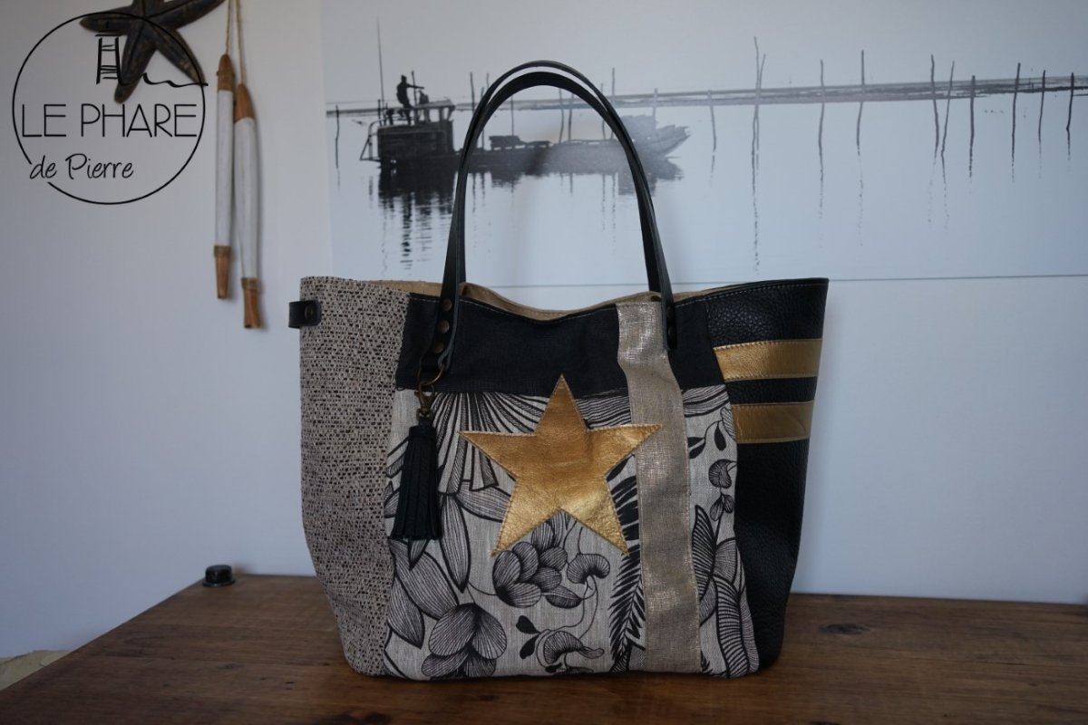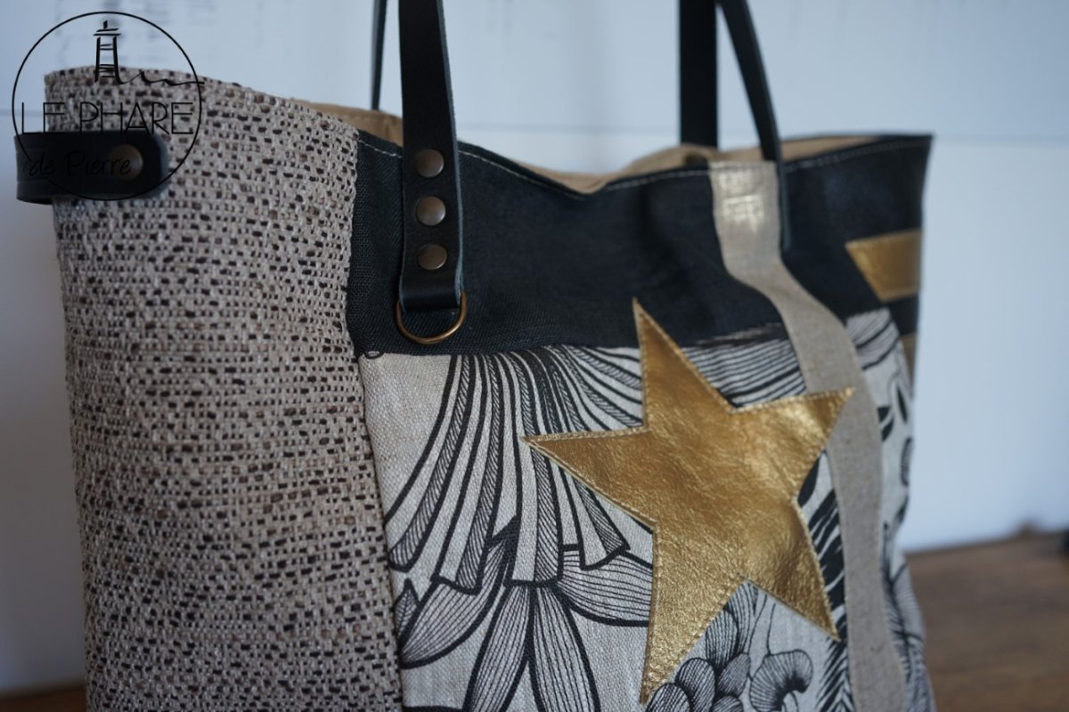 🛍️ Apportez une touche de peps à votre été avec ce cabas en toile, lin et cuir, à la fois pratique, original et plein de caractère. Son étoile en cuir doré, attire le regard avec élégance.