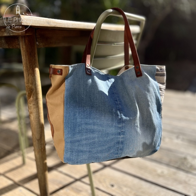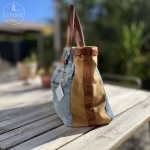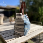 Ce cabas est une pièce unique façonnée à partir d’un jean usé, soigneusement transformé pour devenir un sac au style brut et authentique. Le denim recyclé s’allie au lin rayé et à la toile de coton curry, pour un contraste de matières qui évoque la force et la simplicité des éléments naturels.